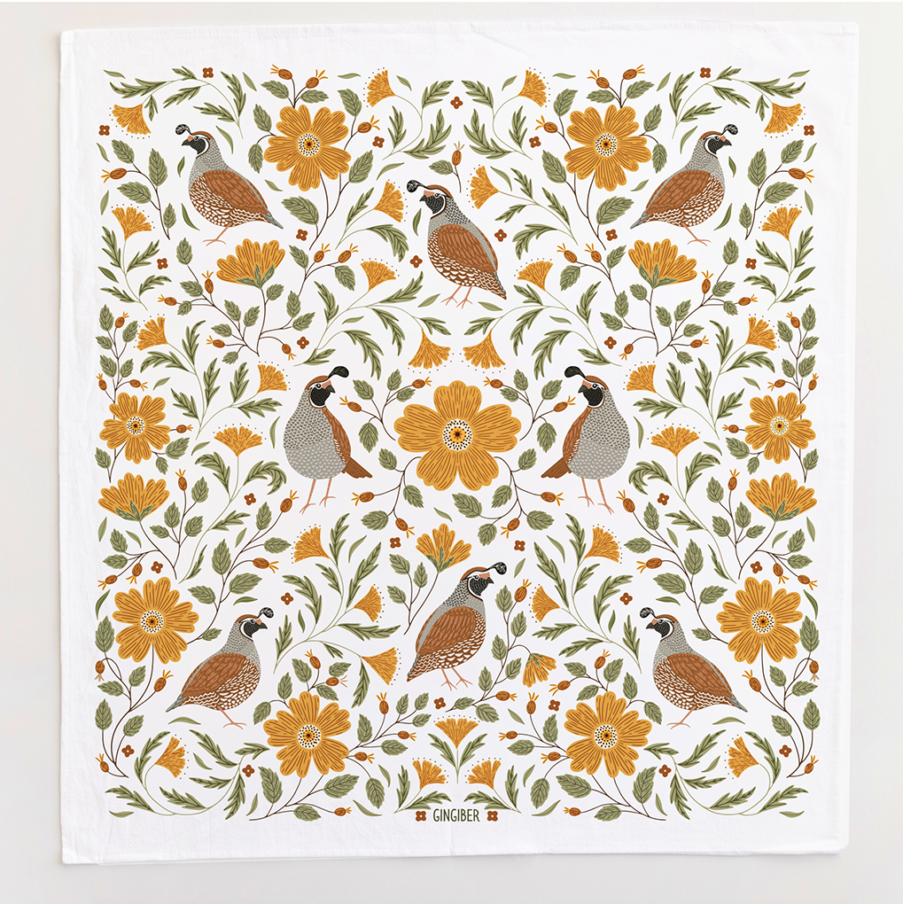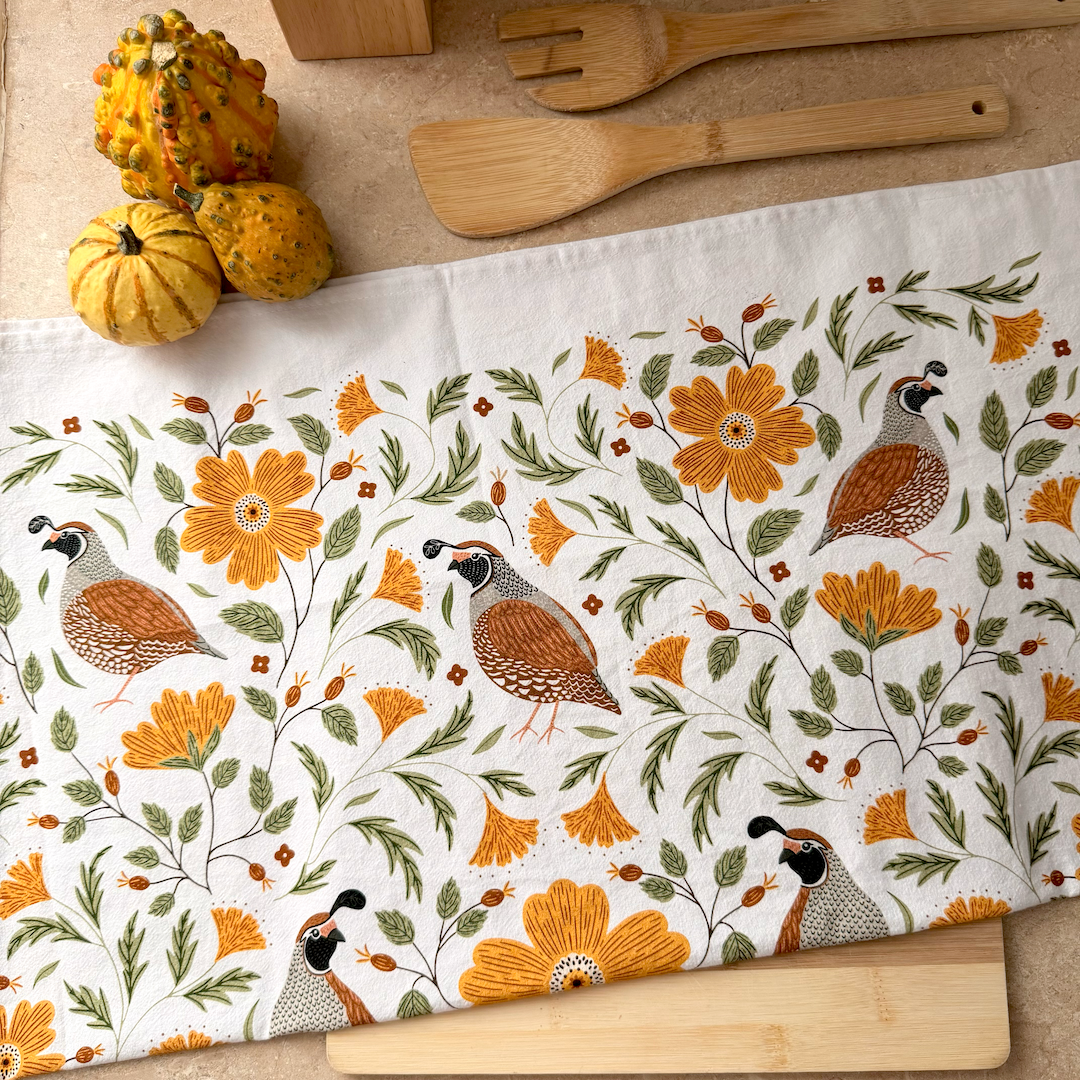 Add a touch of nature and charm to your kitchen with our Quail Bird and Floral Cotton Tea Towel. Featuring Gingiber’s hand-illustrated quails surrounded by golden florals and leafy greens, this artful design brings a cozy farmhouse feel to everyday routines.